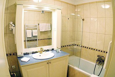 Badkamer in het vijfsterren elegante Queen's Court Hotel and Residence in de binnenstad van Boedapest, Hongarije